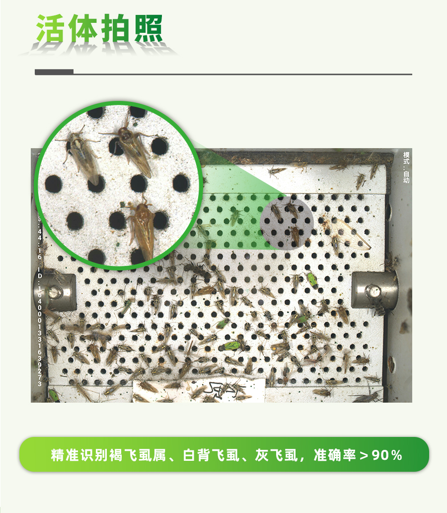 2、活体拍照,精准识别:活虫吸入,虫体完整度98%以上,活体害虫背部朝上,形态特征信息更完整,有效提升识别准确率。